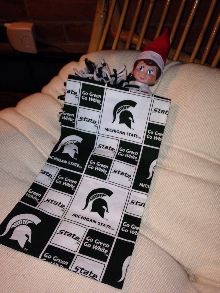 Next up, on Saturday night after the Spartan football team won the Big Ten Championship, my wife fashioned a elvin (or is it “elfish”?) sleeping bag from a wine skin and took a Pom Pom from the American Girl corner. In hindsight, we should’ve taken a couch from the Barbie corner and burned it and flipped a Barbie car over. The kids wouldn’t have gotten the joke, but our friends on Facebook would’ve laughed.