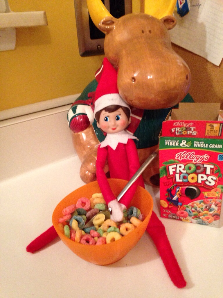 The night before, Sugar Cookie, our Elf on the Shelf, got into a mini box of Fruit Loops.