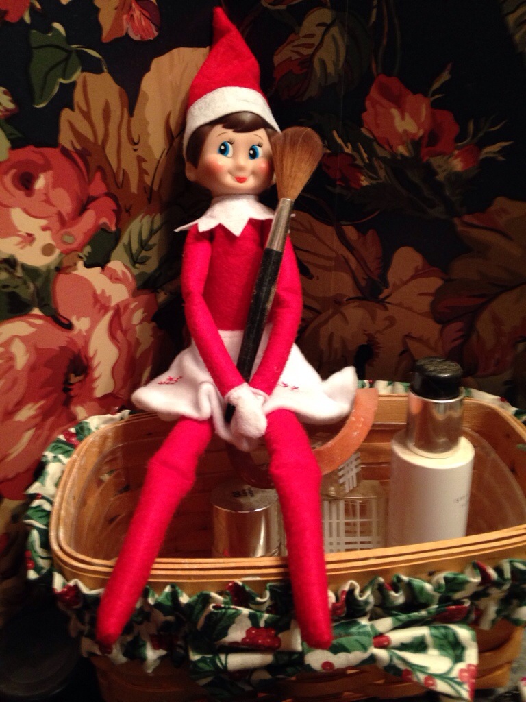 Our Elf on the Shelf is a girl. So she grabbed a skirt while on her overnight adventure back to the North Pole. And then she played with some make-up, and I would yell at her, but for all I know, she’s old enough and her elf parents really gotta make that call.