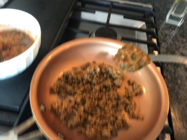 Step 3: Add (2) eggs. If you want them friend and runny, move the meat/salsa mix to the side and let the eggs sit right on the pan’s surface. I personally scramble mine right into the meat/salsa mix.