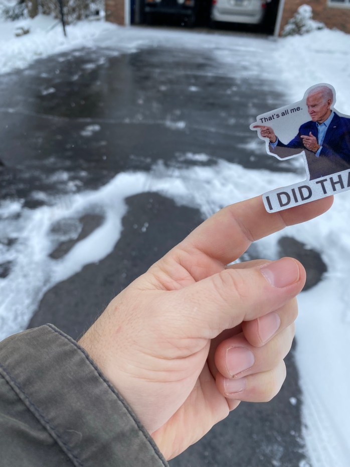 I’m highly amused by this. And I’ll continue to be highly amused by this. And I hope my Biden-blame-sticker quest will amuse others and point a light on how silly it is that any of us let cable news or politicians affect our behavior and attitudes and impact how we treat other people.
