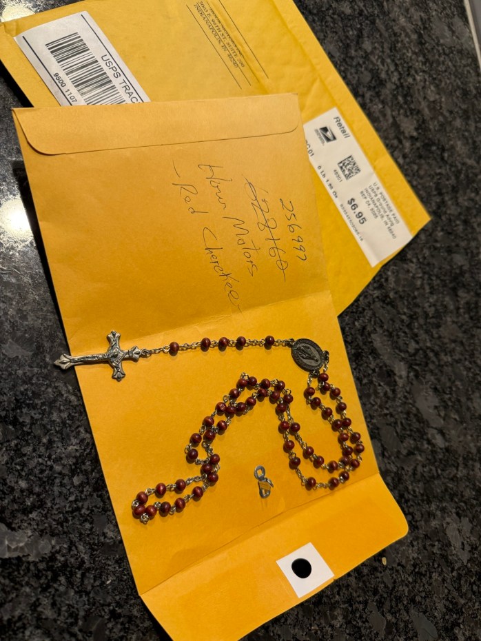 It was beads. It was Rosary beads. Someone at a dealership in Indianapolis, IN must’ve been detailing my old Cherokee and I’ll bet, in that job, a person finds all sorts of treasures. Probably money, loose change, charging cables, lipsticks, gloves, umbrellas, mugs . . . can you imagine all the little things that get left behind in a used car? You and I both know, had this person at this mystery used car dealership in Indianapolis … had this person found anything on that list, I wouldn’t be getting a UPS envelope. But this person did trace down the previous owner (me) and rather than keep the Rosary or throw it away, this person decided to return my Rosary to me. No note. No name. Just my Grandma’s Rosary in the mail from a good person who knew, or heard my Grandma whispering in his ear to return it … this person knew it was important to return the Rosary to me.
