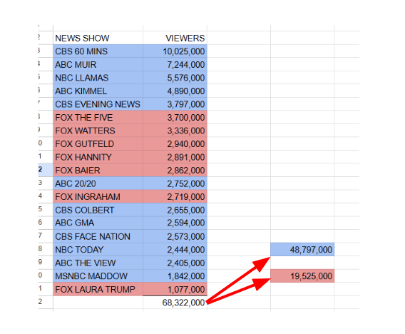 Those numbers surprise me. It tells me of all-news-watching people, 71% are “left”? I’ll arbitrarily add 10-Million to the “right/red” news programs just to try and balance it out a bit, but the #s still make my point . . . the majority of people who vote have better things to do with their time than watch news on TV. This also doesn’t factor in duplication of viewing (which I can’t think of how to determine), but my hunch is if a person is “left” or “right”, chances are that person doesn’t watch one show on the list and nothing else. Meaning … of the 48-Million “left/blue” viewers, and the 29-Million “right/red” viewers, and factoring in 15% overlap or duplication, that takes it down to 58-Million people who spend time watching news.