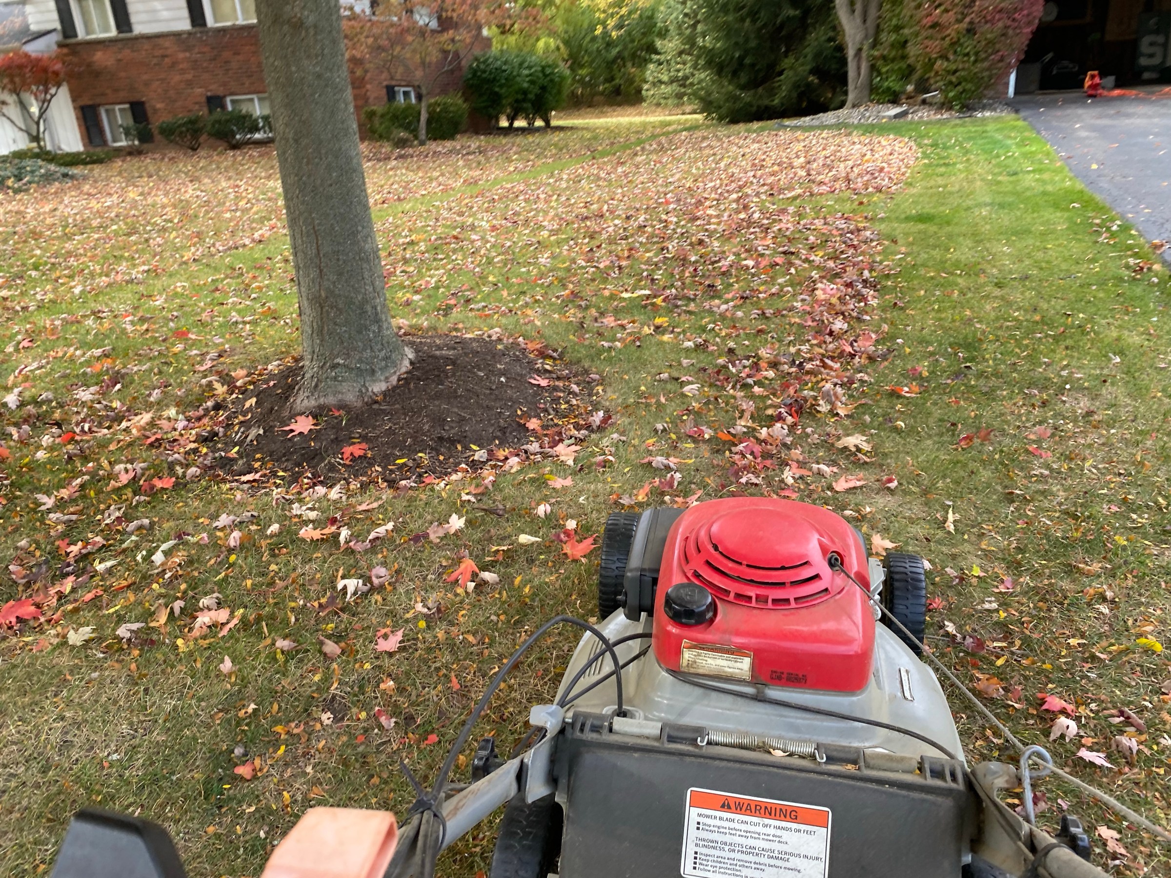 It takes longer and sometimes I employ my leaf blower to blow around the churned up leaves and I mow east-to-west, then criss-cross-mow north to south. Then leaf blow my lawn and flower beds again and re-mow east-to-west, but I’m convinced it’s still less time and effort than raking and bagging and all that organic matter becomes soil over the winter.