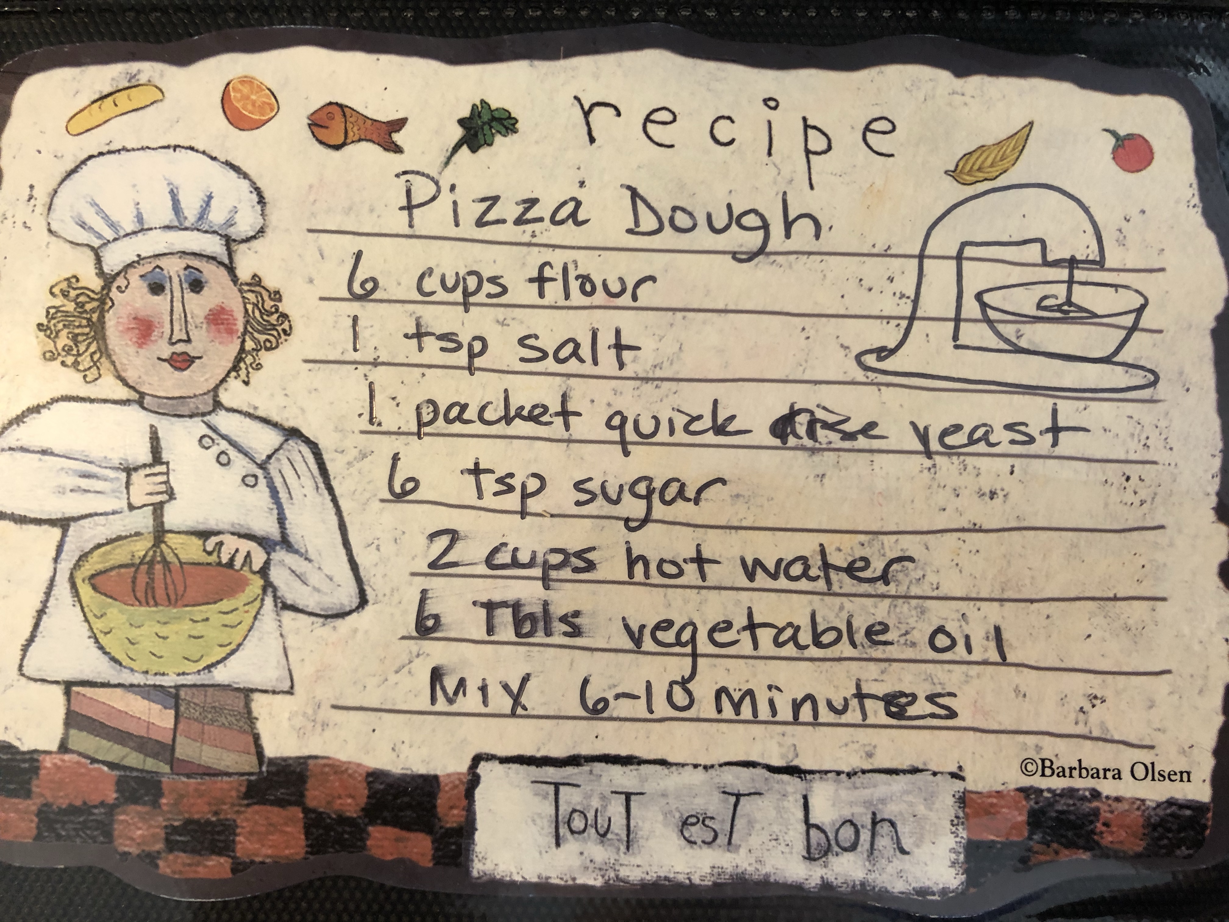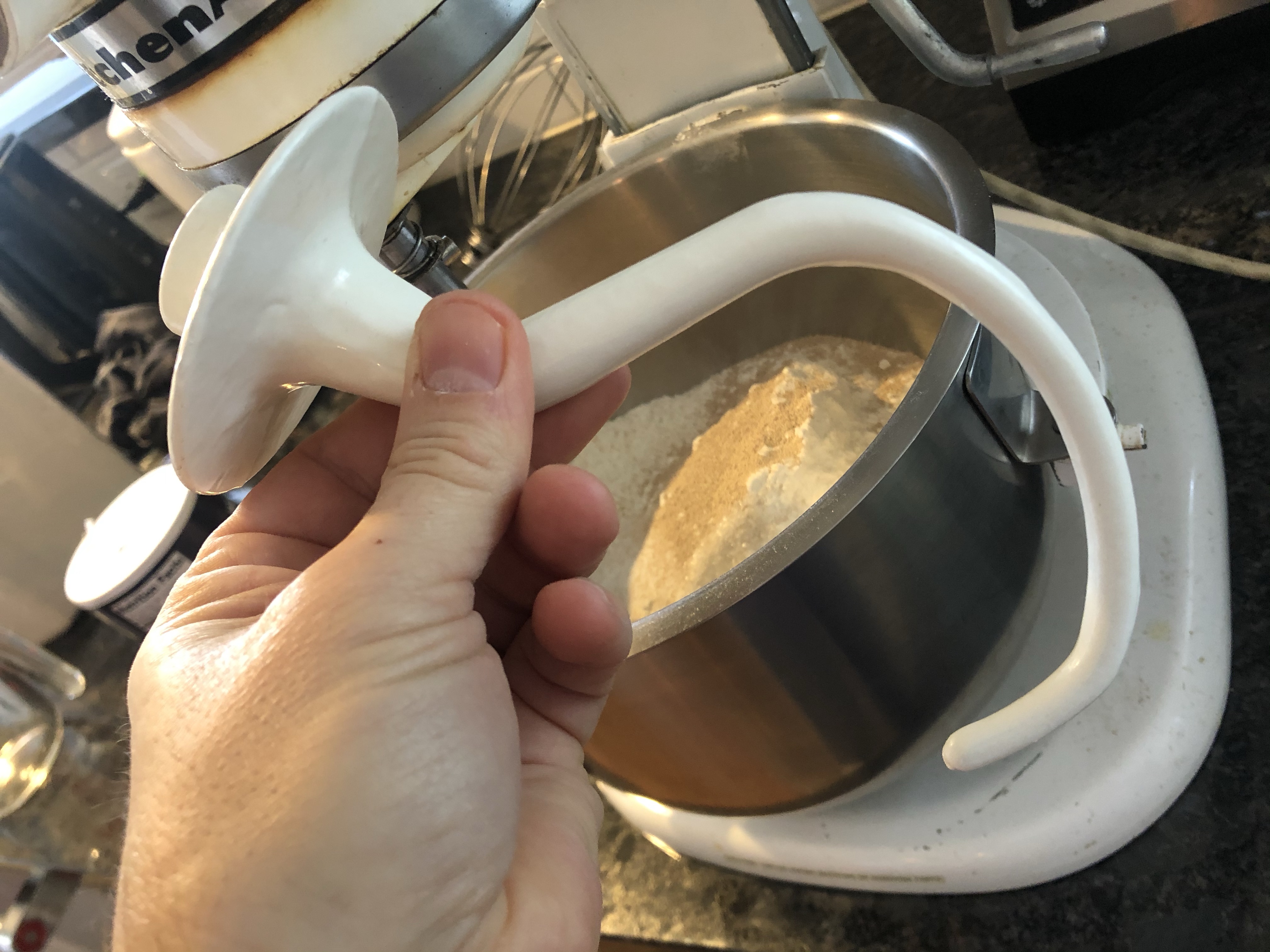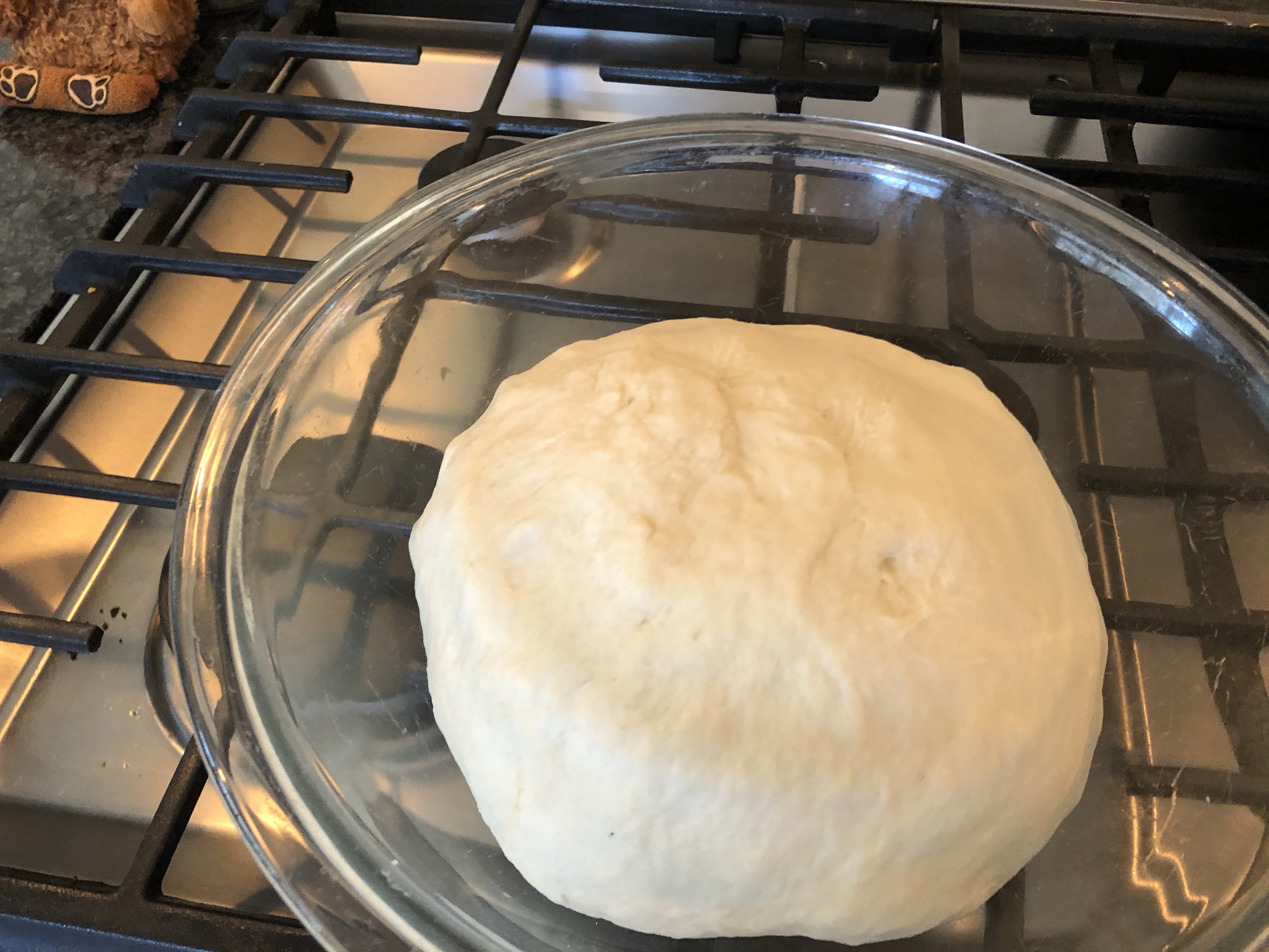 99% of the time, after 6-10 minutes in the mixer, it’s a perfect ball of dough. Form it into a ball about the size of a mini-basketball and cover it. If you can put it in the oven at 145 degrees or less, it will rise. Punch it down every 45 minutes for an hour and a half. Note: You don’t really need all that punching and kneeding, but it does make it rise better when baking.
