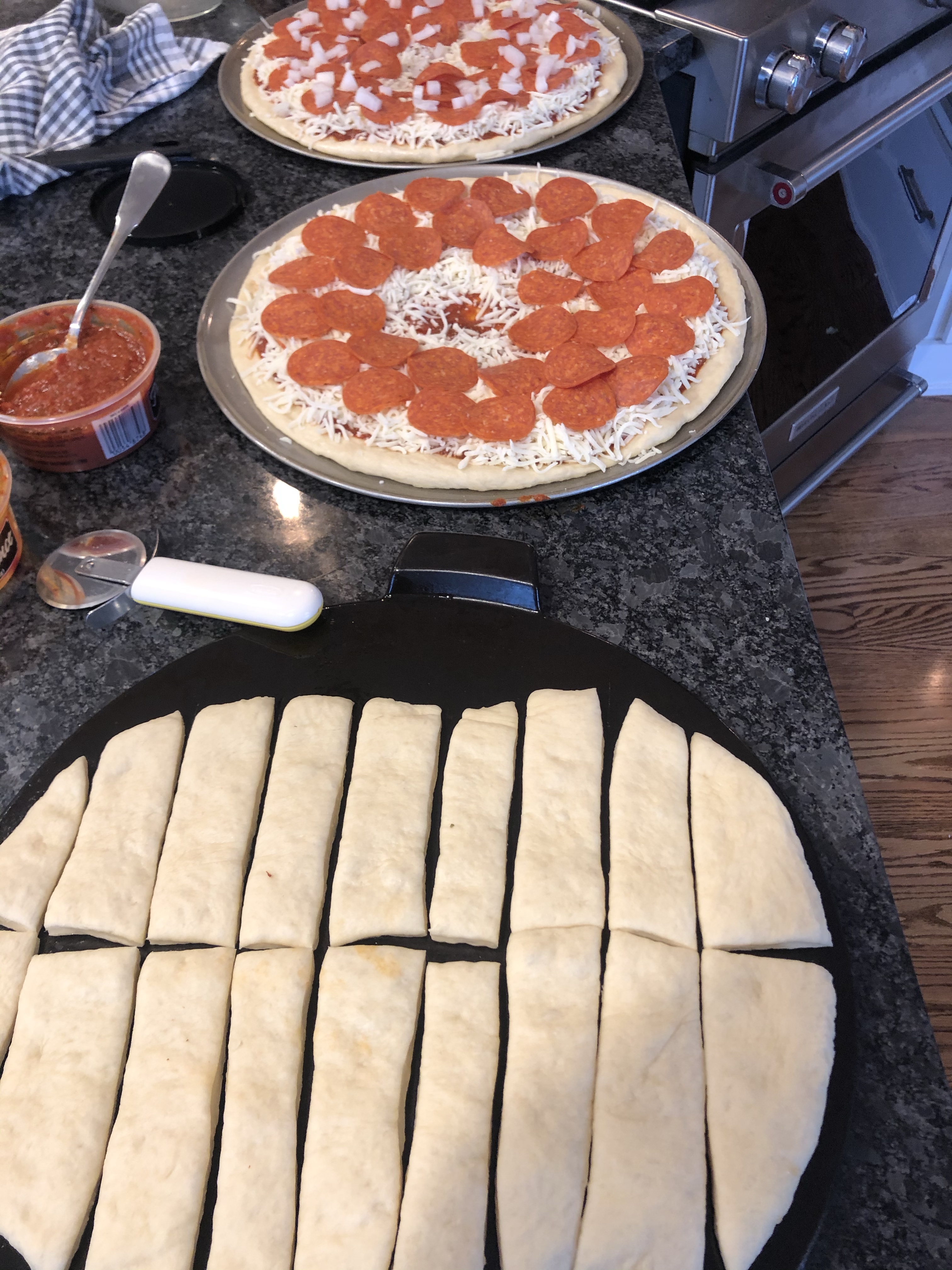 I use two 15-inch stainless steel pizza pans from Sur La Table (because I’m fancy) and a ceramic pizza stone thingy (I don’t know where I got it). Put a nickel size worth of veggie oil on each pan and smear it around. Then, with oily hands, split the dough into three nearly equal balls of dough (about 1 lb and 1 ounce each). The biggest ball should be the breadsticks.