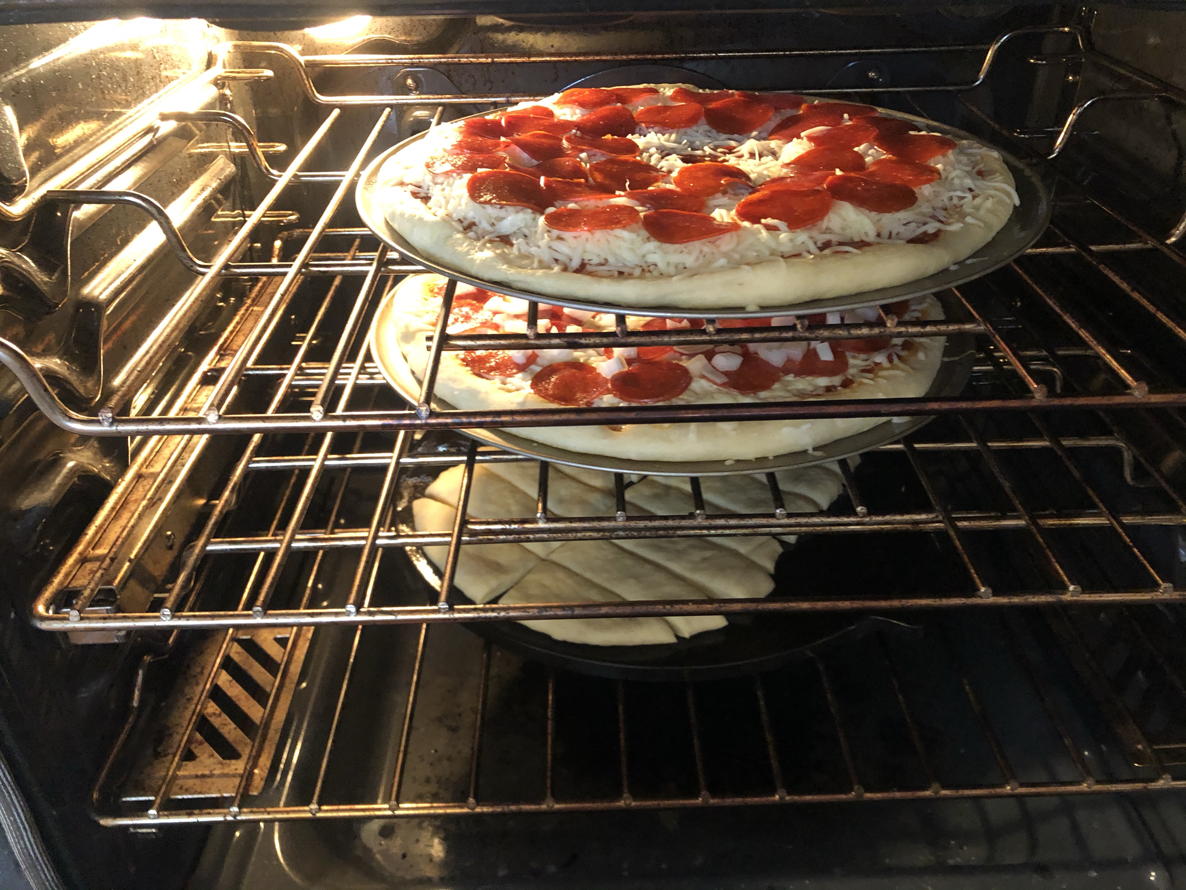 Put the pizza with the most toppings in first on the top rack. All by itself. At the 20 minute mark, put the more boring pizza in. Middle rack. At the 18 minute mark, put the breadsticks in on the bottom rack. Now you start watching. Move them about every 6 minutes. Rotate them. Each pizza will want to spend some time on the bottom rack to crisp up the bottom crust.