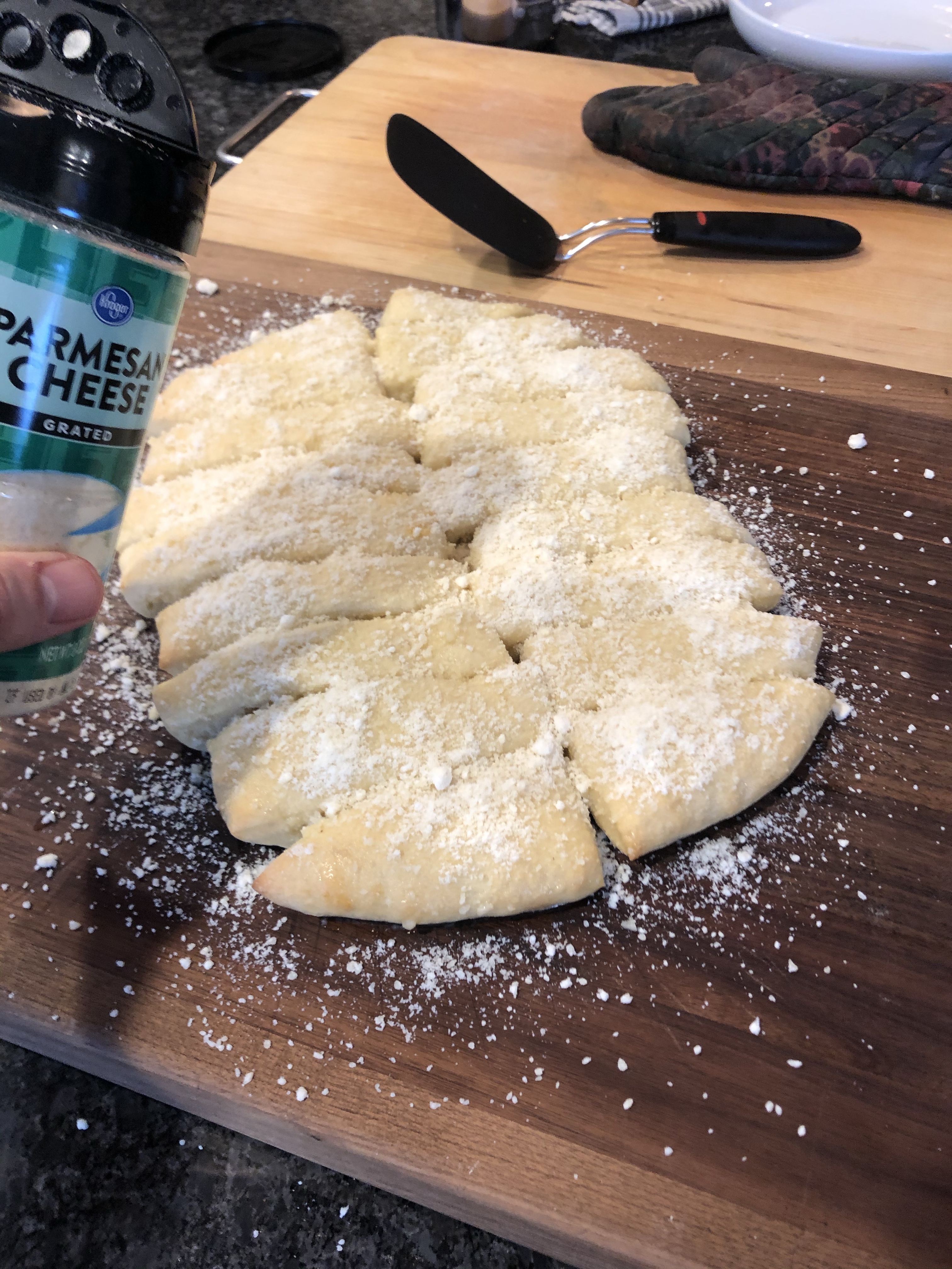 At 22 minutes (or when they look done and about to burn), take the breadsticks out. Melt 3 TBSPs butter and 1 TSP garlic in a pan and then paint them onto the breadsticks. Then shake a generous amount of parmesan cheese over them.